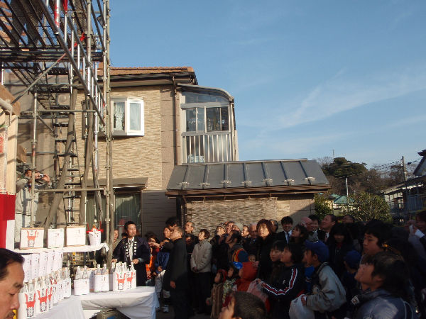 弊社のお客様の上棟式が行われました。お天気にも恵まれ、ご近所の方も大勢お集まりくださいました。最近では珍しくなりましたが、古式に則り、お餅巻きなどあり子どもも多くにぎやかでした。