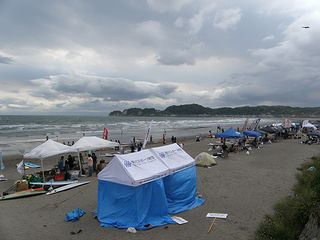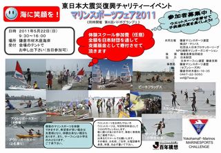 22日(日)、材木座海岸にて”マリンスポーツフェア2011 鎌倉”がに開催されました。(主催:鎌倉マリンスポーツ連盟他)マリンスポーツに親しんでもらうきっかけとして例年は無料で行われていますが、今年は任意の参加費をもらって全額震災の復興支援金として寄付されるそうです。イベント参加者はウェットスーツがなくても1000円でレンタルできるので、気軽に「お試し」体験できます。道具を揃えるのがたいへん・・・やってみたいけど、イマイチ不安・・・