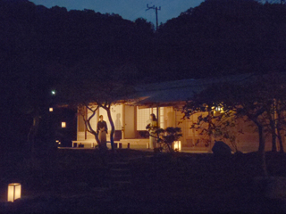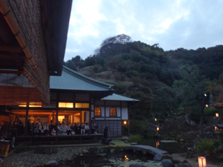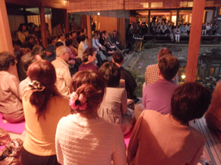 中庭での演奏は谷全体に響き渡るような、庭全体を使った演出がされており、夕暮れ時の庭園に行燈が点々と置かれ、竣工したばかりの弊社設計・施工の書院「玄能庵」もまるで舞台装置の一部となり舞台を見ているような感覚でした。