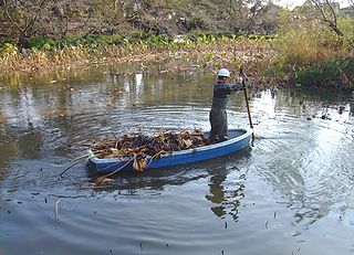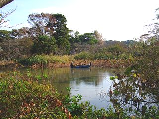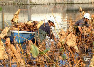 いわし雲のたなびく秋空の下、風流な舟遊び? と思いきや・・・蓮池の掃除を行っていました。夏の間、私たちの目を楽しませてくれた大輪の蓮、一本ずつ手作業で刈り取られています。盛夏の頃の様子はこちら