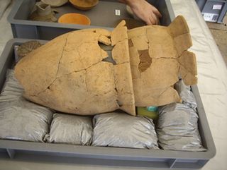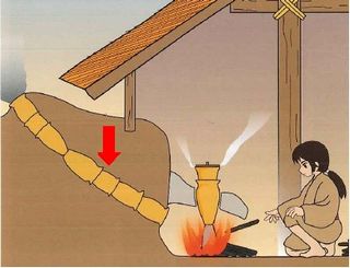 土師器(ハジキ)のカメを重ねた煙の穴は途中で向きが変わっていることから、内と外両方から穴を掘って設えていったと思われます。