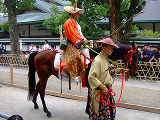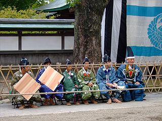 髻(もとどり・いわゆるちょんまげですね)をいれる為に中央が高くなっている綾藺笠(あやいがさ)、直垂(ひたたれ)を着て、射籠手(いごて)を左腕につける。