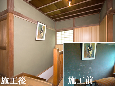 今回の改修では雨漏りがする瓦屋根と谷の部分の改修、傷みが進んだ砂壁の塗り直し、朽ちた庇の修理を行いました。