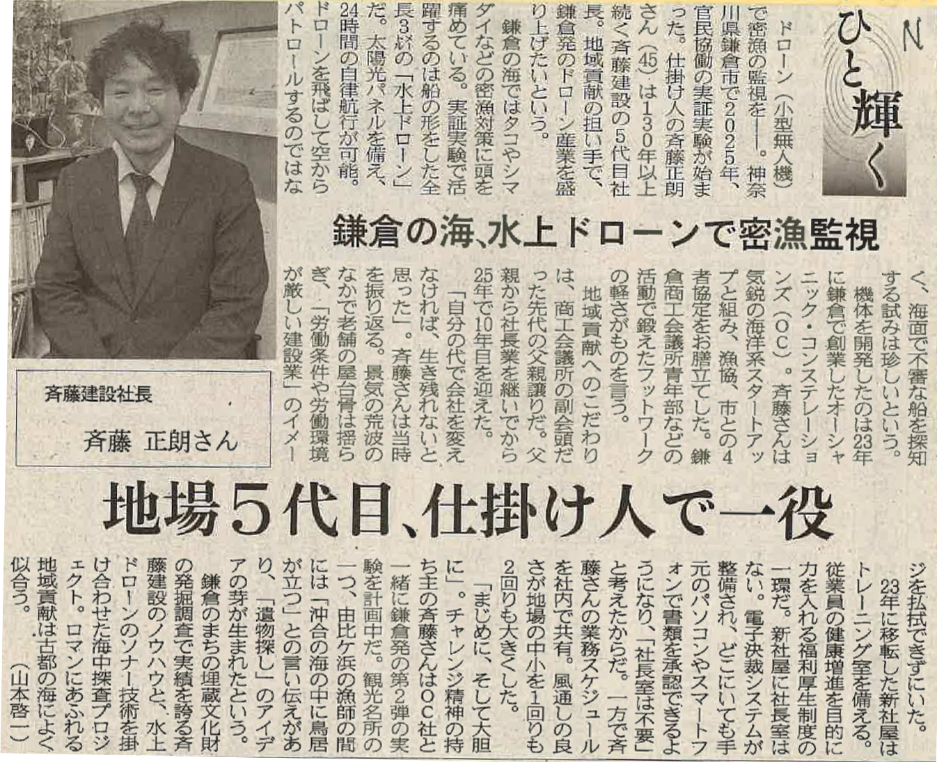 記事では、鎌倉の海で広がる密漁問題に対し、斉藤が水上ドローンを活用した監視実験に取り組んでいることや、地域の漁協や行政と連携し、安全な海づくりに貢献している様子が取り上げられています。